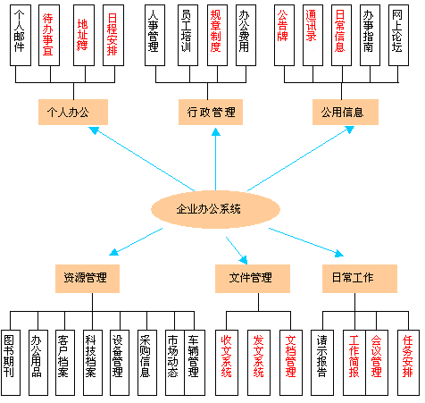 企業(yè)辦公系統(tǒng)的主要目標是實現(xiàn)企業(yè)辦公及事務管理,有效地提高企業(yè)辦公效率、節(jié)約辦公經費、創(chuàng)建企業(yè)文化。是辦公系統(tǒng)與管理信息系統(tǒng)的結合,系統(tǒng)有多個單獨模塊組成,體系結構如下: