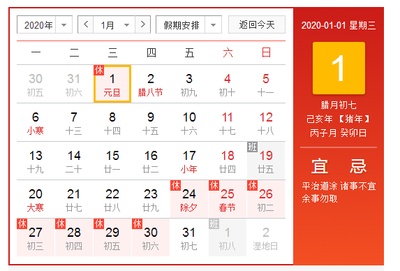 2020年1月1日(星期三)放假,共1天。2020年1月2日(星期四)正常上班。