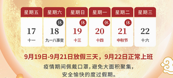 根據(jù)國務(wù)院辦公廳關(guān)于2021年部分節(jié)假日安排的通知,萬科網(wǎng)絡(luò)中秋節(jié)放假安排如下:
